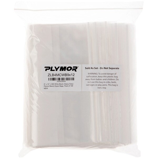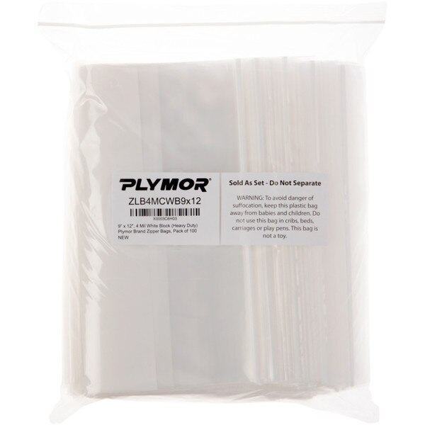 Plymor 9" x 12" (Pack of 100), 4 Mil with White-Block Heavy Duty Zipper Reclosable Plastic Bags