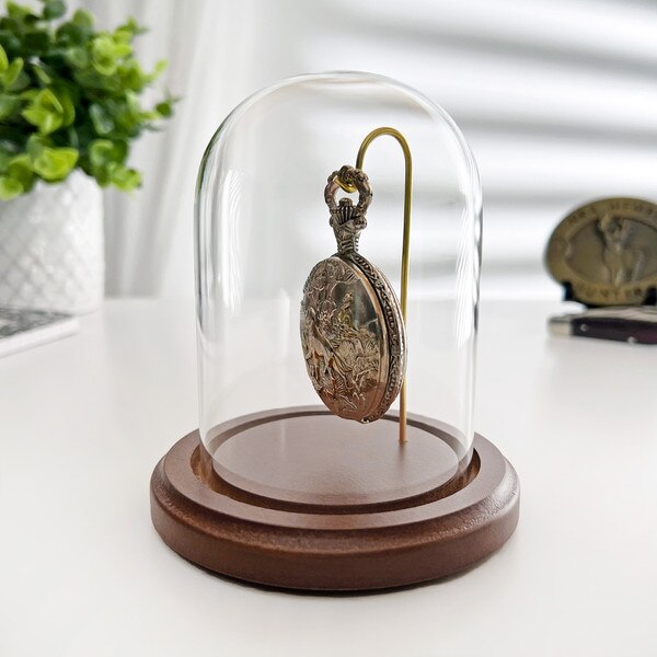 Style: This dome includes a dark wood base that is 4 inches in diameter and 0.5 inches thick and features a removable brass wire which leaves about 3 inches from the base to the bottom of the hook. Handcrafted glass domes can vary slightly in thickness and/or clarity which adds character to your display.