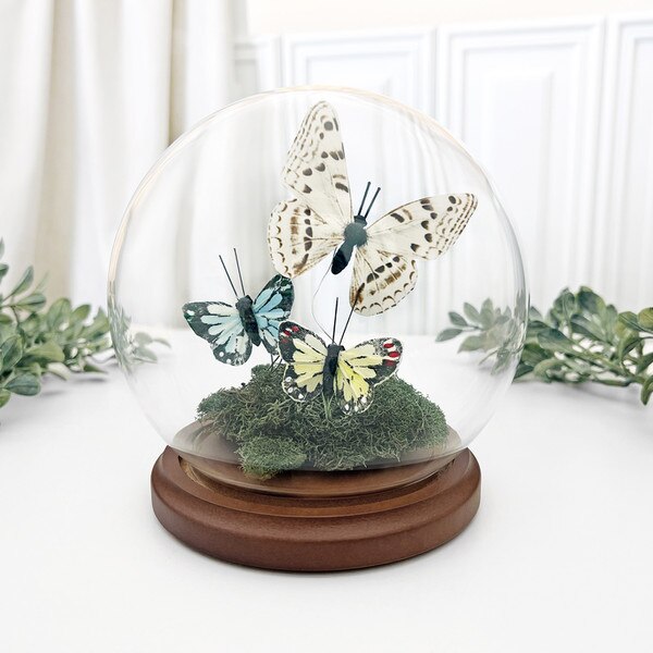 Style: This dome includes a dark wood base is 5.425 inches in diameter and 0.625 inches thick. Handcrafted glass domes can vary slightly in thickness and/or clarity which adds character to your display.