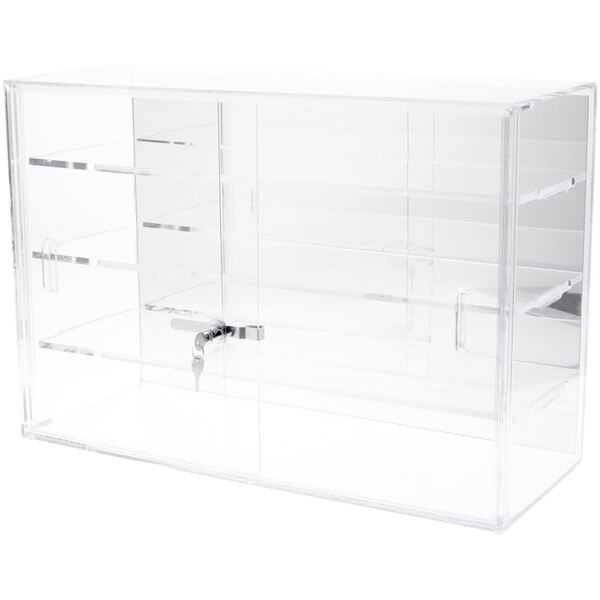 Plymor Clear Acrylic Locking Display Case with Sliding Back, 3 Shelves (Mirrored), 18" H x 26" W x 10" D